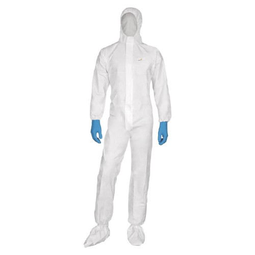 Combinaison avec cagoule élastiquée non-tissé microporeux laminé. Fermeture avec zip sous rabat. Elastique de serrage à la tête, à la taille, aux poignets et aux chevilles. Usage unique & emballage individuel.