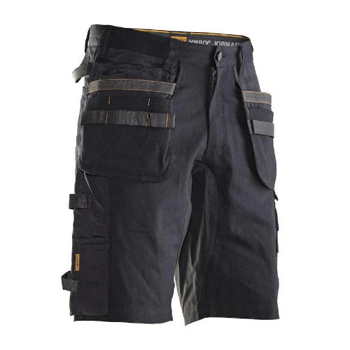 Short avec grandes poches étuis s’insérant dans les poches avant. Poches arrière renforcées à l’intérieur. Anneau porte-marteau. Anneaux supplémentaires sur les grandes tailles. Poche mètre et porte-couteau avec bouton. Poche jambe avec fermeture éclair, poche téléphone, poche porte badge et compartiment supplémentaire.