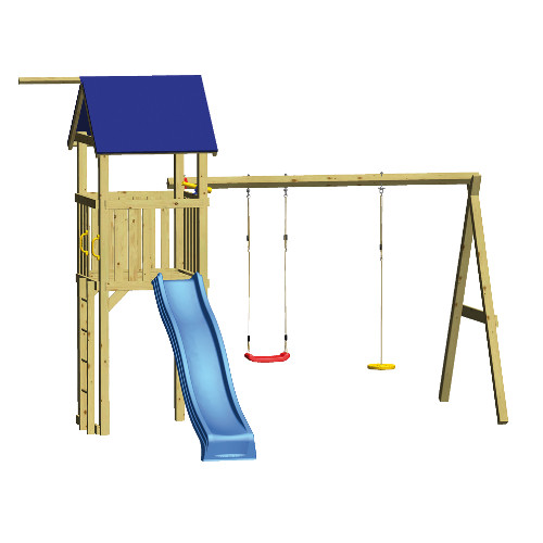 La variante WINNETOO SWING est un kit complet pouvant recevoir plusieurs extensions au choix. Elle comprend: 1 x tour de jeux WINNETOO 113 x 113 x 350 cm, 4 x ancrage au sol SAFETY PLUS, 1 x support portique en A, 2 x ancrage au sol pour support portique en A, 1 x poutre portique balançoire 290 cm, 1 x support rouge pour portique, 1 x toboggan à vagues bleu 295 cm, 3 x crochets de balançoire SAFETY, 1 x siège de balançoire rouge, 1 x balançoire disque jaune, 1 x kit de 2 poignées jaunes.
